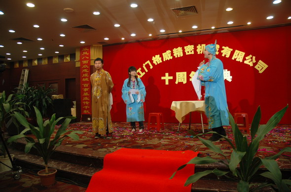 2012年3月25日是江門格威精密機(jī)械有限公司成立十周年的大喜之日,為了慶祝十年廠慶,公司組織了一系列豐富多彩的慶典活動,如出公司廠報,出畫冊,制作公司發(fā)展歷程的視頻,25日晚還組織了隆重的聚餐、娛樂表演暨2011年度優(yōu)秀員工頒獎和十年老員工頒獎活動。全廠員工歡聚一堂,在大家的歡聲笑語中,在高層領(lǐng)導(dǎo)和各位同仁的觥籌交錯中,我們的慶典活動在當(dāng)晚八點鐘圓滿結(jié)束了。